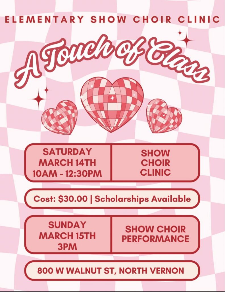 Jennings County Elementary students in kindergarten through sixth grade are invited to participate in the 3rd Annual “A Touch of Class” Show Choir Clinic on Saturday, March 14, 2026, at Jennings County High School, 800 W. Walnut St., North Vernon.